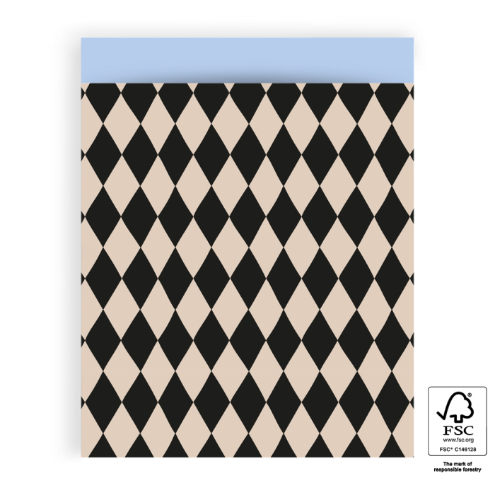 Machen Sie jedes Geschenk zu etwas Besonderem mit den stilvollen Geschenkbeuteln von House of Products. Dieses nachhaltige FSC®-zertifizierte Papier zeigt ein spielerisches Harlekinmuster in Schwarz und Beige. Die hellblaue Innenseite verleiht einen subtilen, frischen Akzent. Die flachen Beutel sind in verschiedenen Größen erhältlich und ideal für Geschäfte und Onlineshops, die vielseitige Verpackungslösungen suchen. Perfekt zum Verpacken kleiner bis mittelgroßer Geschenke. Wählen Sie Qualität, Stil und Nachhaltigkeit mit diesen einzigartigen Geschenkbeuteln von House of Products. Beeindrucken Sie Ihre Kunden mit einer schönen Präsentation und tragen Sie zu einer besseren Welt bei.