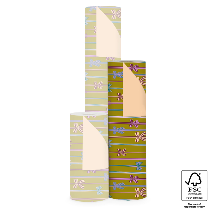Dieses Geschenkpapier bringt Freude auf den Ladentisch! Die 150 Meter lange Rolle zeigt ein festliches Design mit Schleifen in Jadegrün, Rosa, Bordeauxrot und Pfirsich auf olivgrünem Hintergrund. Die Rückseite in zartem Pfirsichton verleiht dem Papier einen stilvollen Kontrast. Ideal für Geburtstage, Feste oder einfach so. Gefertigt aus FSC®-zertifiziertem Papier - nachhaltig und hochwertig. Perfekt für Läden, die besonderen Wert auf stilvolles Verpacken legen. Kombiniere es mit passenden Bändern und Stickern von House of Products.