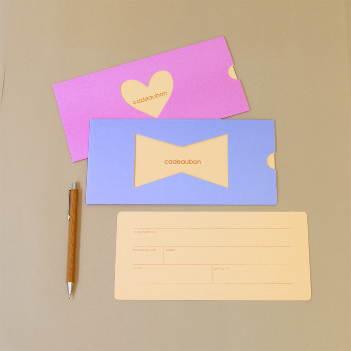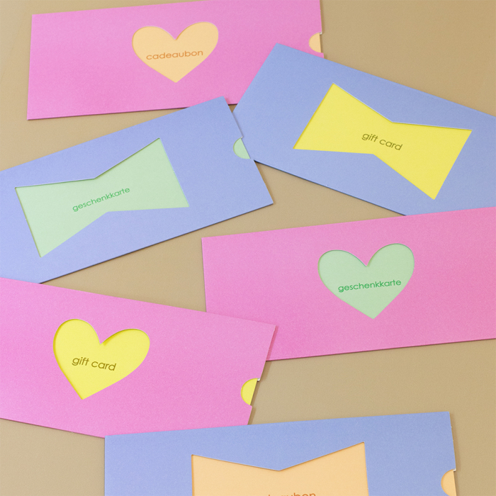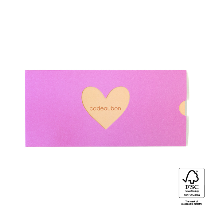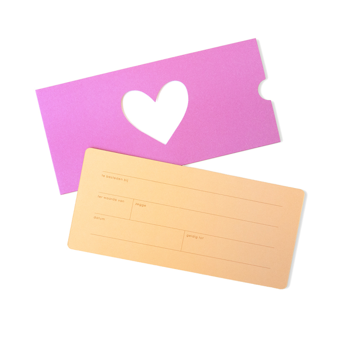 Ein fröhliches Geschenkkartenset mit 20 rosafarbenen Hüllen, die eine herzförmige Aussparung aufweisen, durch die der Text „Geschenkkarte“ sichtbar ist. Die passenden Inlays sind mit einem niederländischen Text bedruckt und orangefarben. Die Karten sind auf stabilem Papier gedruckt und werden als komplettes Set geliefert. Perfekt für Geschäfte und Webshops, die eine stilvolle und praktische Art und Weise suchen, Geschenkgutscheine zu präsentieren. Die Geschenkkarten sind FSC®-zertifiziert.