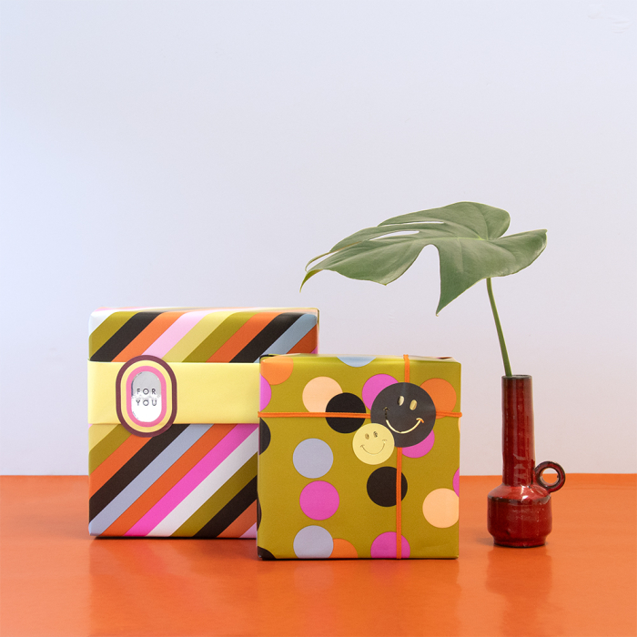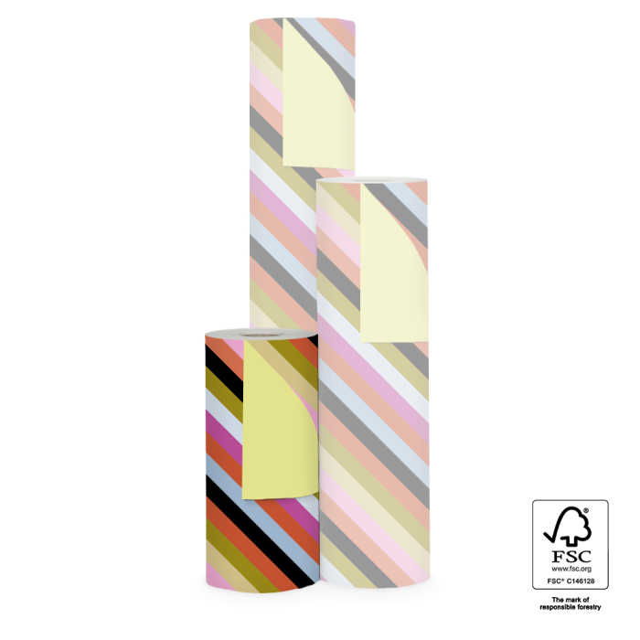Entdecken Sie die Vielseitigkeit unserer 150-Meter-Geschenkpapierrolle, die sich für jeden Anlass eignet. Das Design mit breiten Streifen in Rosa, Cognac, Oliv, Schwarz und Hellblau sorgt für einen auffälligen und stilvollen Look. Die gelbe Rückseite verleiht jedem Geschenk ein fröhliches Detail. Dieses Geschenkpapier ist ideal für Einzelhändler, die ihre Kunden mit schönen, nachhaltigen Verpackungen überraschen wollen. House of Products bietet FSC®-zertifiziertes Geschenkpapier, Aufkleber und Bänder an, damit Sie Ihre Geschenke unbesorgt verpacken können.